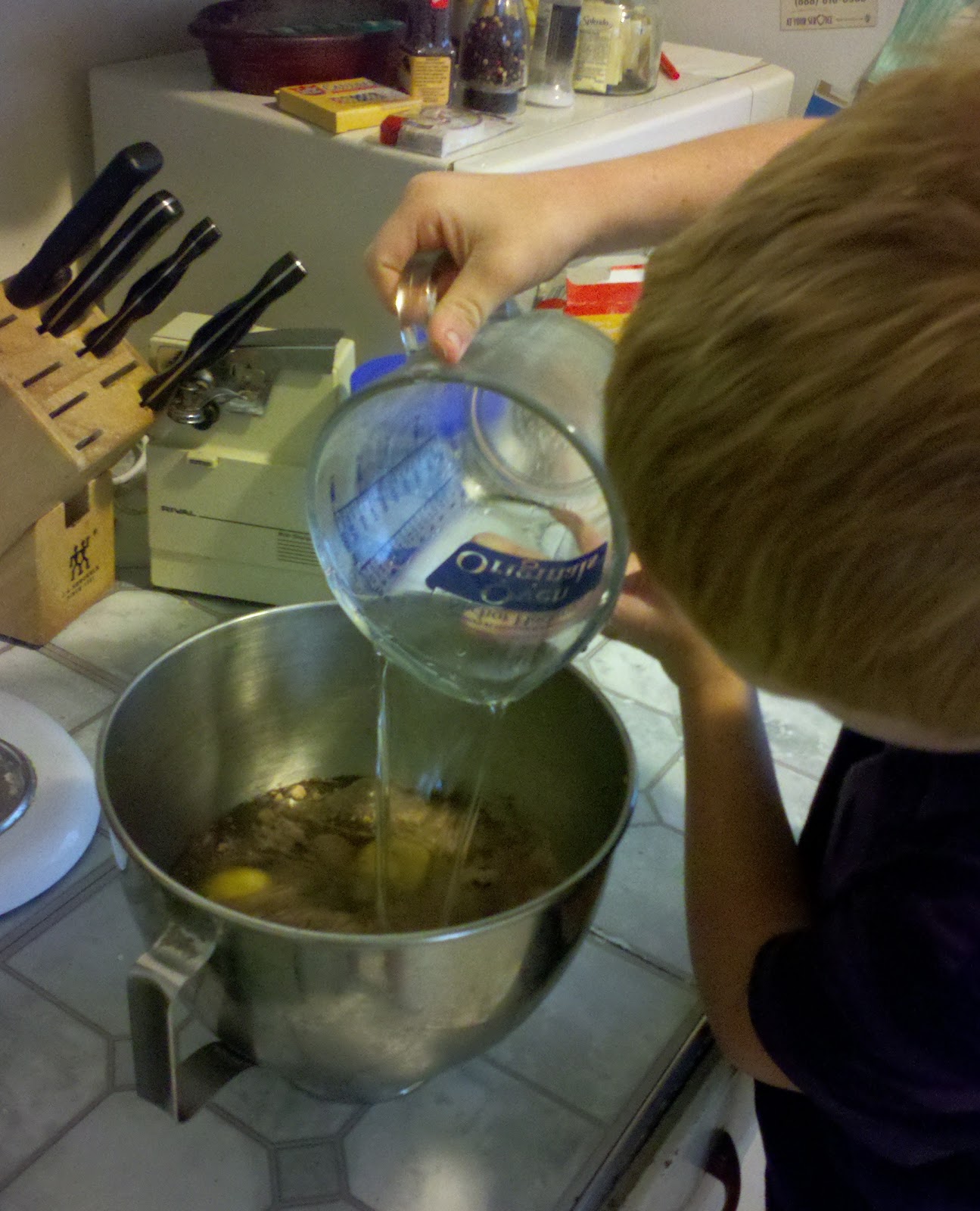 Aidan and I saw the cakes at the store, and we just decided it was much better to make our own, especially since we had the day off for Lincoln's Birthday. He decided on a Devil's Food cake with strawberry icing filling and white frosting with chocolate sprinkles. So here we go...